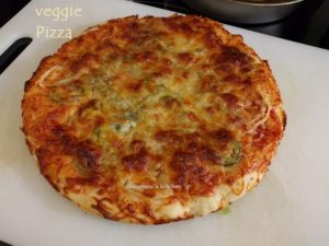 - Take a 9 inch round or flat pan dust it with some sooji / rava, then place once half of the dough and spread with your fingers gently and apply the pizza sauce first, followed by mozzarella cheese, veggies, herbs, salt and topped with some grated parmesan cheese.