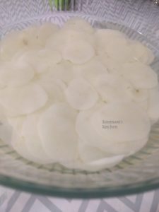 - Wash and peel the skin and slice it very thinly using mandoline slicer.